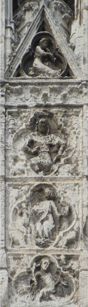1 Personnage barbu et encapuchonné de face. 2 Personnage assis. Une bande d'étoffe lui barre la poitrine. Il porte un objet indistinct dans sa main gauche. A sa droite il semble y avoir un petit personnage debout, la main droite levée en signe de salut. 3 Personnage aux jambes croisées. Il tient dans sa main droite un objet qui ressemble à un sceptre et une sorte de petit chapeau dans sa main gauche. |