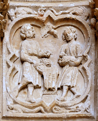 4.3 le temps passa et il advint que Caïn présenta des produits du sol en offrande à Yahvé, 404 et qu'Abel, de son côté offrit des premiers-nés de son troupeau, et même de leur graisse. Or Yahvé agréa Abel de son offrande. 4.5 mais il n'agréa pas Caïn de son offrande, et Caïn en fut très irrité et eut le visage abattu. 4.6 Yahvé dit à Caïn : "Pourquoi es-tu irrité et pourquoi ton visage est-il abattu ?" 4.8 cependant, Caïn dit à son frère Abel : "Allons dehors", et, comme ils étaient en pleine campagne, Caïn se jeta sur son frère Abel et le tua. La Genèse (I, 4.3-6,8) Au-dessus de l'autel, une main se dirige vers Abel et indique que Dieu agrée son offrande.