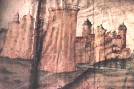 reprise en main de la ville par le Capétien. Il ne reste maintenant de ce château que le donjon. C'est la grosse tour qui est représentée au milieu du dessin. Elle n'était pas couronnée par cette toiture conique actuelle due aux restaurateurs du XIXème siècle. Sur la gauche est la tour des champs, celle qui devrait porter le nom de Jeanne d'Arc puisque c'est là qu'elle fut emprisonnée. L'aqueduc de la source Gaalor passe juste sous cette tour comme on le voit sur le dessin. |