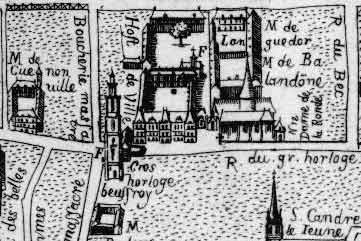 Le quartier en 1655 L'ancien hôtel de ville occupait tout le pâté de maisons entres les rues du Gros-Horloge et aux Juifs. Il était composé d'en ensemble hétérogène de pans de bois. En 1525, on entrait par une large porte qui ouvrait sur le petite place devant l'église Notre-Dame de la Ronde. A l'époque de Mme Leprince de Beaumont, on avait construit un nouvel hôtel de ville monumental le long de la rue du Gros-Horloge. Il est parfaitement visible sur les plans Zeller et Gomboust. |