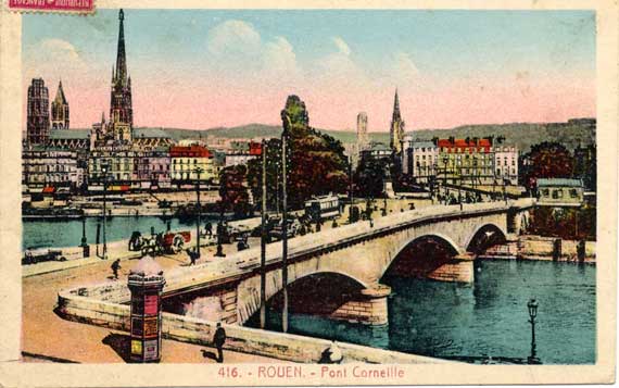 siècle, aucun n'avait abouti. En 1789, un ingénieur du nom de Lamandé proposa un nouveau pont. Pour garantir l'intégrité du bassin portuaire, il situait le franchissement projeté à la pointe de l'île Lacroix. En 1810, Napoléon Ier vint visiter la ville. Il promit la création du pont de pierre et tint parole. Toutefois, il fallut attendre 1829 pour que le pont fut enfin terminé. Il avait la forme d'un accent circonflexe largement ouvert (141°). Appelé Pont de Pierre lors de sa construction, il devint le Pont Circonflexe (du fait de sa forme), puis le Pont d'Angoulême, puis Pont d'Orléans en 1830 avant de devenir le Pont Corneille en 1848. Il fut détruit par le Génie français lors de l'entrée de l'armée allemande dans la ville. |