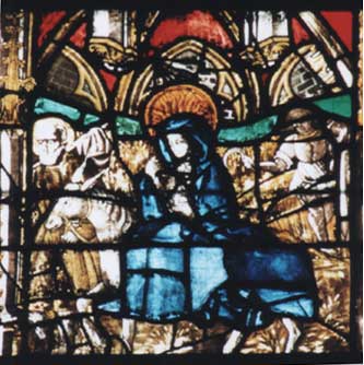 La Vierge est montée sur un mulet, précédée de Joseph. Derrière est figuré le miracle du blé coupé.